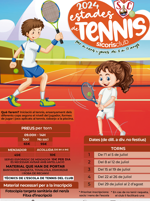 Estades de Tennis Estiu 2024Jaume CornadóMay 20, 20241 min de lecturaJa estan obertes les inscripcions per a les Estades de Pàdel 2024. A continuació us deixem la info, amb torns, preus i butlleta d'inscripció. FITXA D'INSCRIPCIÓ