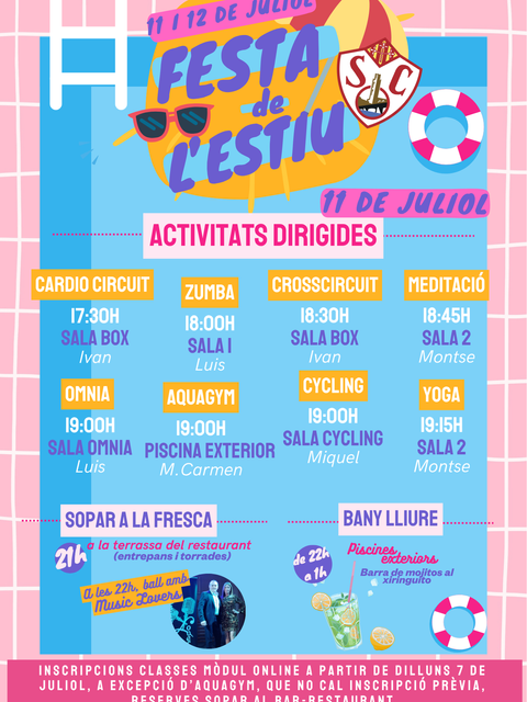 Les inscripcions per a les activitats dirigides s’obriran dilluns 7 de juliol, excepte l’Aquagym. Totes les activitats són exclusives per als/les socis/es, així com la jornada dels inflables de dissabte. Les reserves per al sopar a la terrassa es fan directament al Bar-Restaurant.